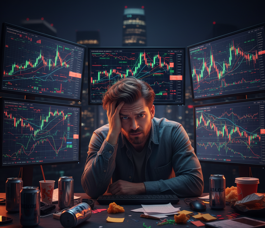 Lembro perfeitamente de uma fase lá entre 2021 e 2022 quando eu operava de forma completamente compulsiva. Passava horas e horas analisando gráficos, testando dezenas de indicadores diferentes, entrando em qualquer setup que aparecia na minha frente.